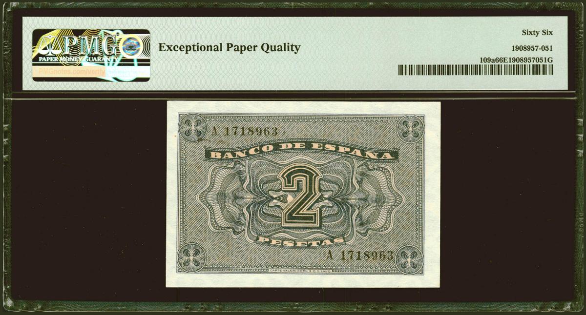 2 Pesetas. 30 de Abril de 1938. Serie A. (Edifil 2021: 429, Pick: 109a). Inusual en esta excepcional calidad, apresto original. SC. Encapsulado PMG66EPQ.