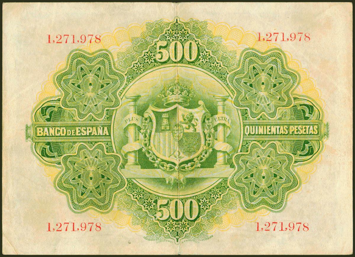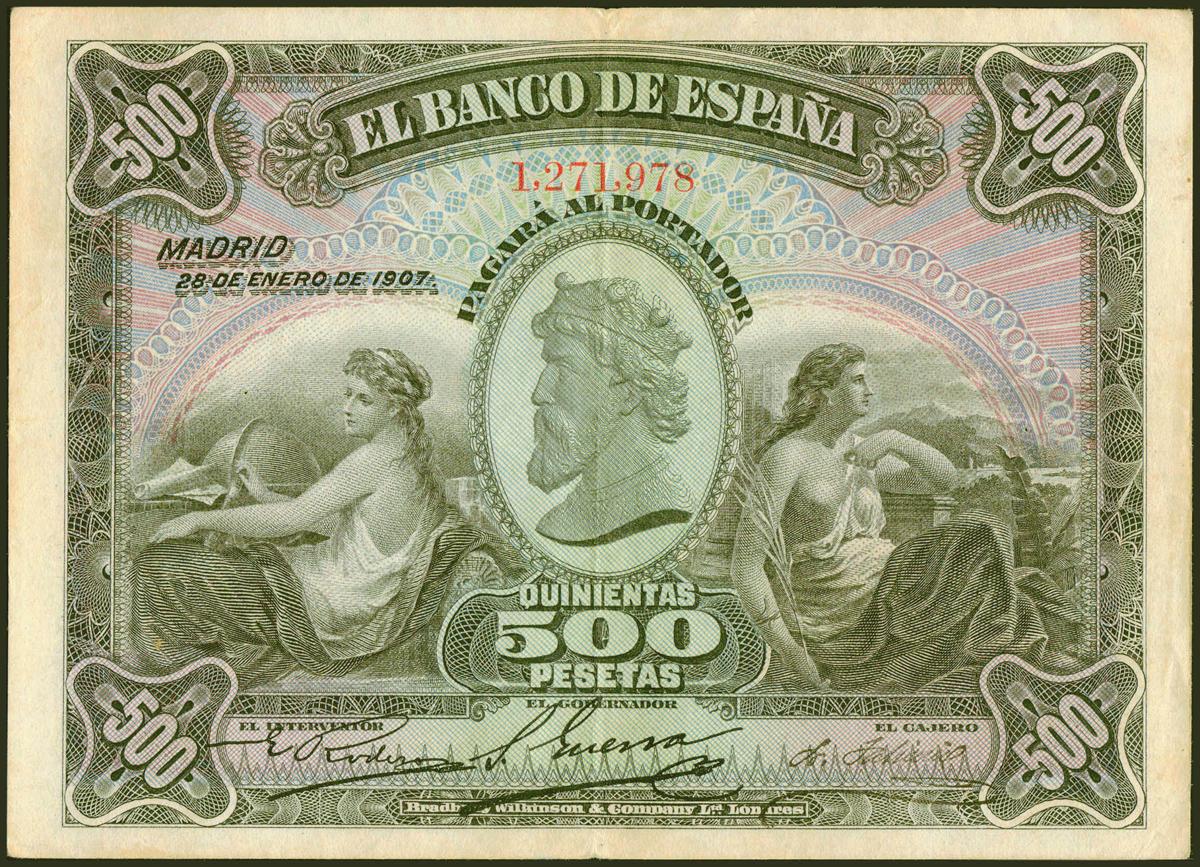 500 Pesetas. 28 de Enero de 1907. Sin serie. (Edifil 2021: 316). Raro, especialmente sin ninguna reparación, la mayoría de ejemplares han sido restaurados, puntitos de grapa. MBC+.