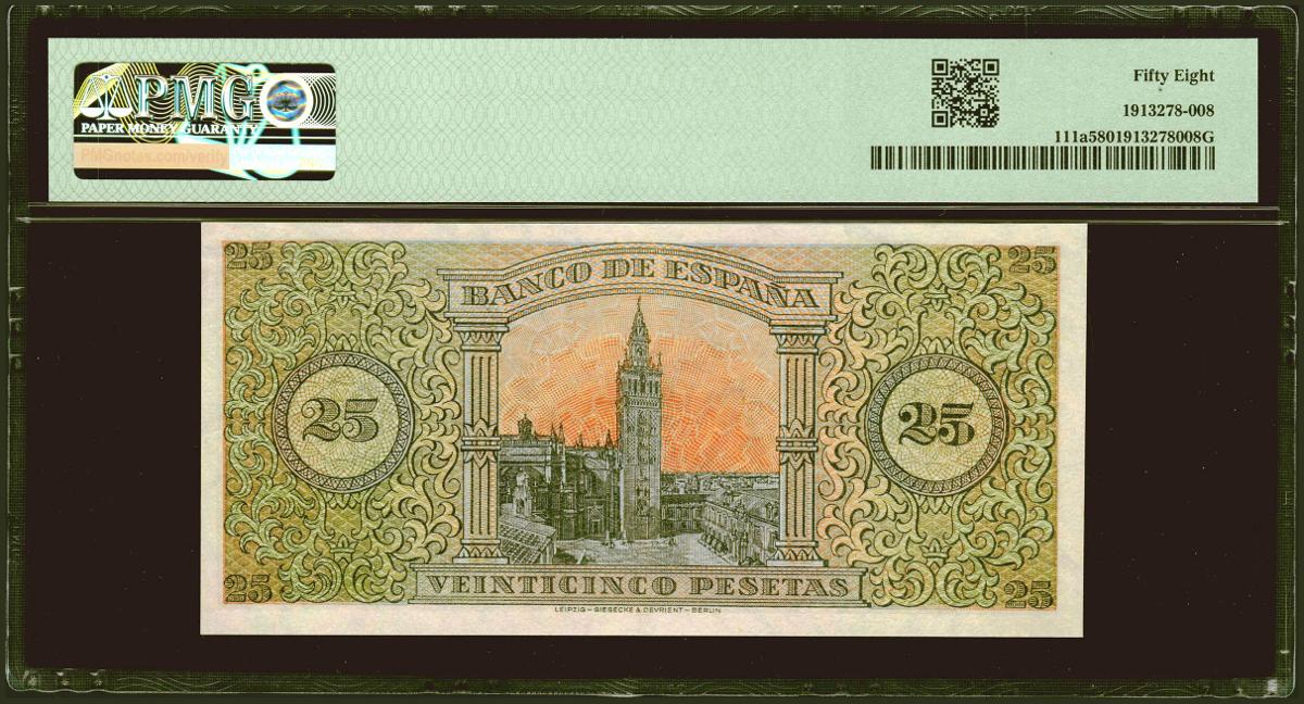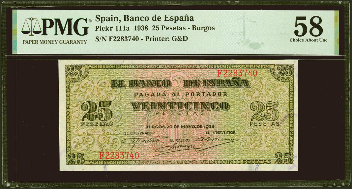 25 Pesetas. 20 de Mayo de 1938. Serie F, última serie emitida. (Edifil 2021: 430a, Pick: 111a). Apresto original. EBC++. Encapsulado PMG58.