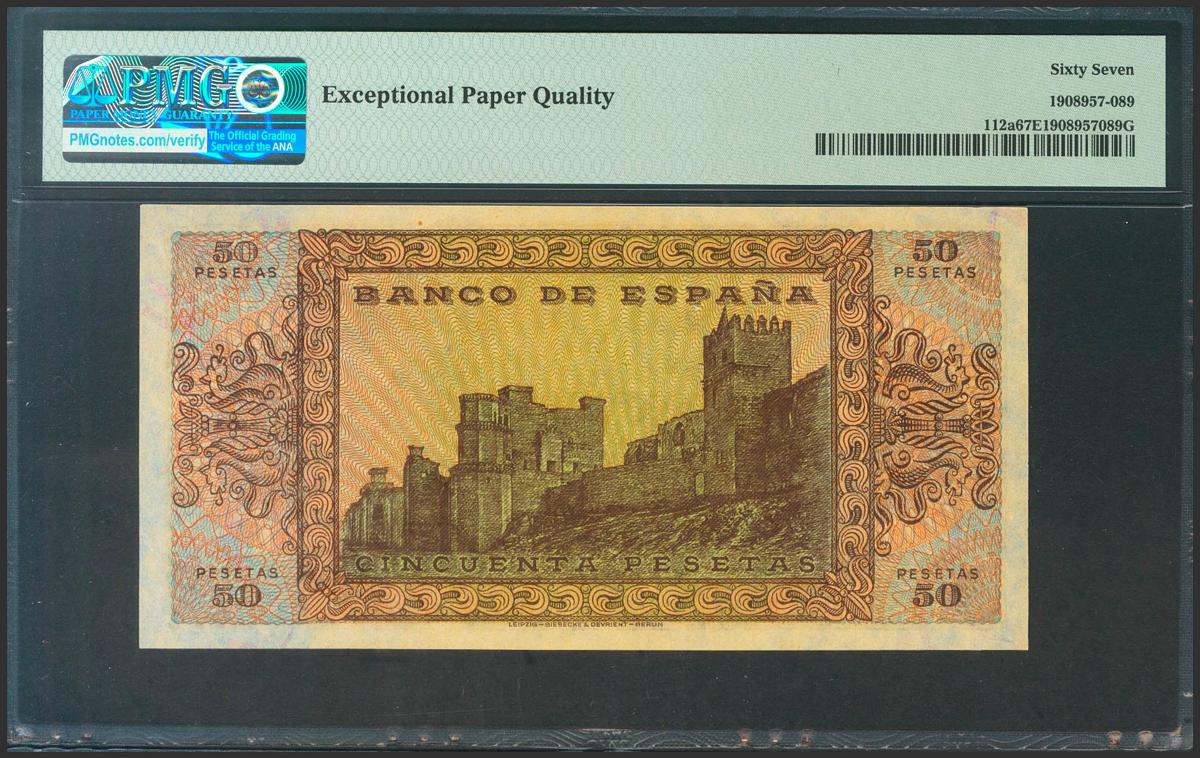 50 Pesetas. 20 de Mayo de 1938. Serie A. (Edifil 2021: 431, Pick: 112a). Rarísima en esta calidad, apresto roiginal. SC. Encapsulado PMG67EPQ. (para hacernos idea de la rareza, a fecha 1 de Junio de 2023, este billete es el mejor calificado junto a otros cinco billetes en PMG)