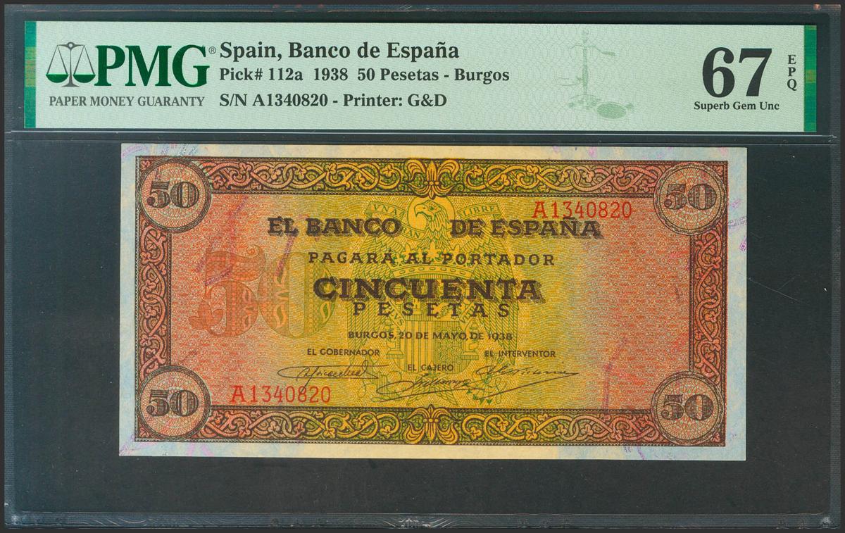50 Pesetas. 20 de Mayo de 1938. Serie A. (Edifil 2021: 431, Pick: 112a). Rarísima en esta calidad, apresto roiginal. SC. Encapsulado PMG67EPQ. (para hacernos idea de la rareza, a fecha 1 de Junio de 2023, este billete es el mejor calificado junto a otros cinco billetes en PMG)