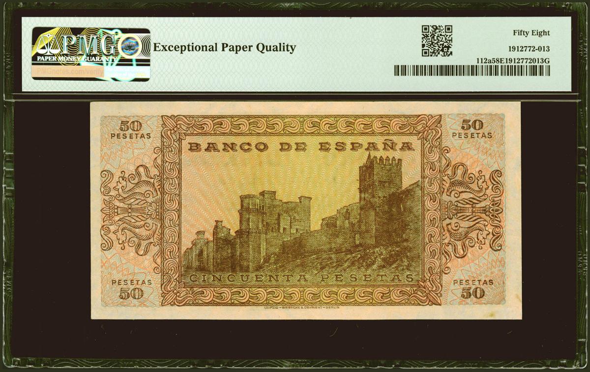 50 Pesetas. 20 de Mayo de 1938. Serie C. (Edifil 2021: 431a, Pick: 112a). Apresto original. EBC+++. Encapsulado PMG58EPQ.