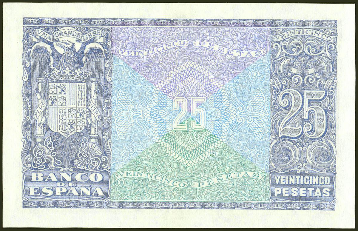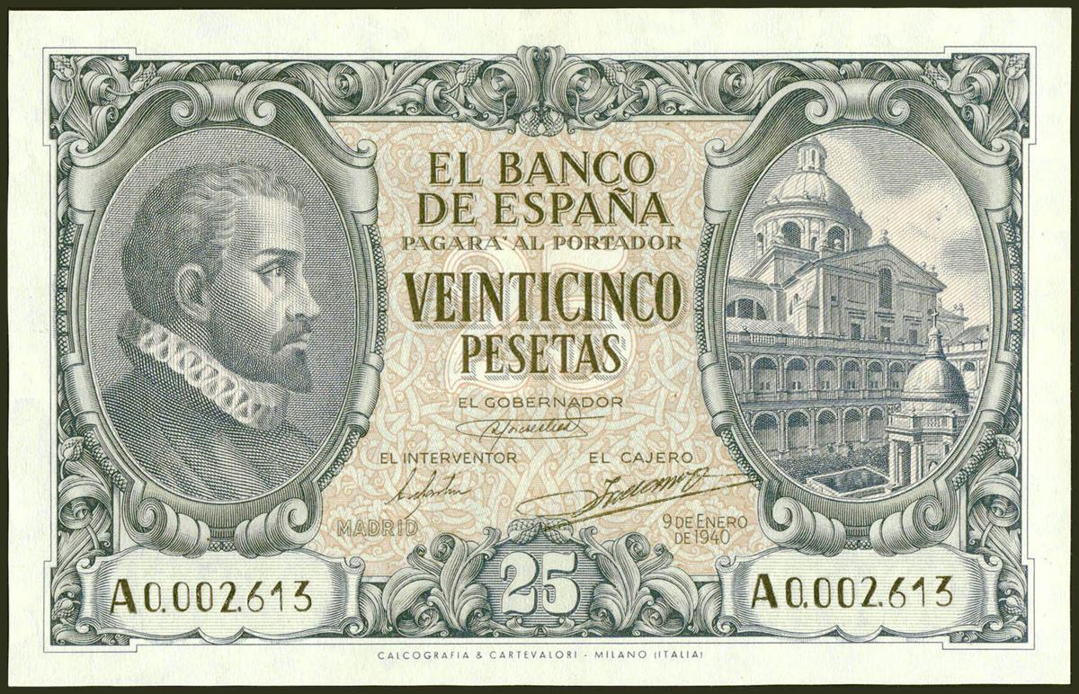 25 Pesetas. 9 de Enero de 1940. Serie A y numeración bajísima (A0002613). (Edifil 2021: 436). Conserva gran parte de su apresto original. EBC+.