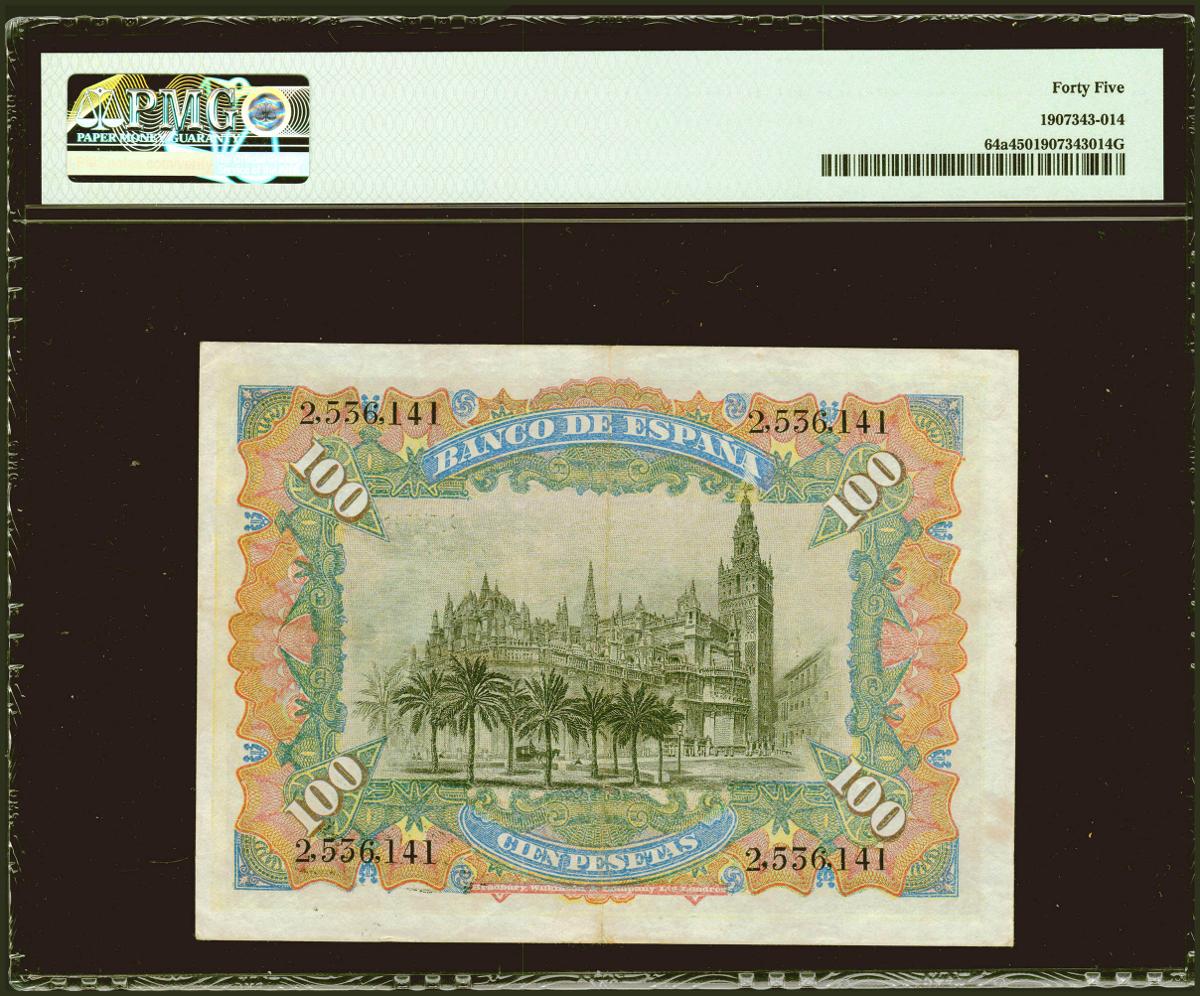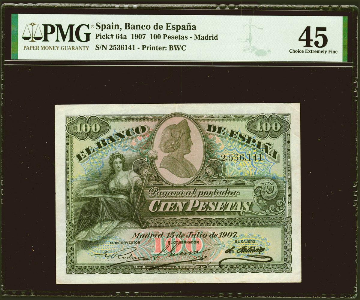 100 Pesetas. 15 de Julio de 1907. Sin serie. (Edifil 2021: 320, Pick: 64a). EBC-. Encapsulado PMG45.