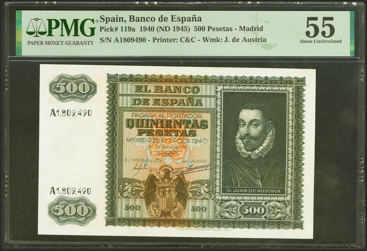 500 Pesetas. 9 de Enero de 1940. Serie A. (Edifil 2017: 439). Muy raro en esta calidad. EBC+. Encapsulado PMG55.
