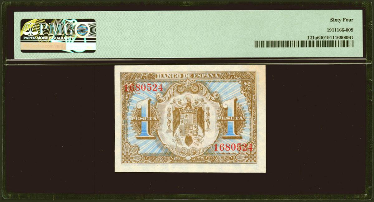 1 Peseta. 1 de Junio de 1940. Sin serie. (Edifil 2021: 441, Pick: 121a). Inusual. SC. Encapsulado PMG64.
