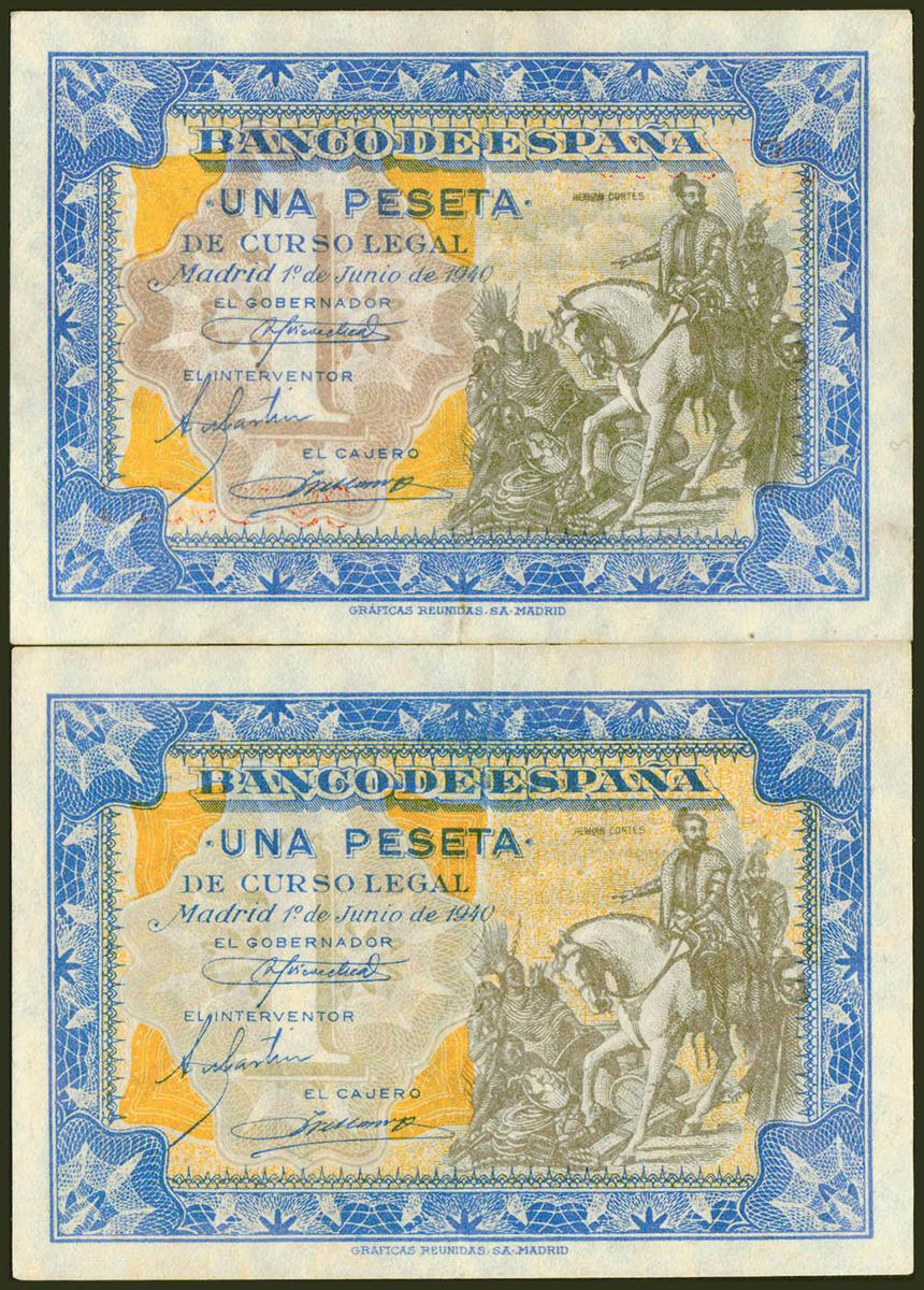 Conjunto de 2 billetes de 1 Peseta emitidos el 1 de Junio de 1940, con las serie B y C, respectivamente (Edfil 2021: 441a), conservando gran parte de su apresto original. EBC.