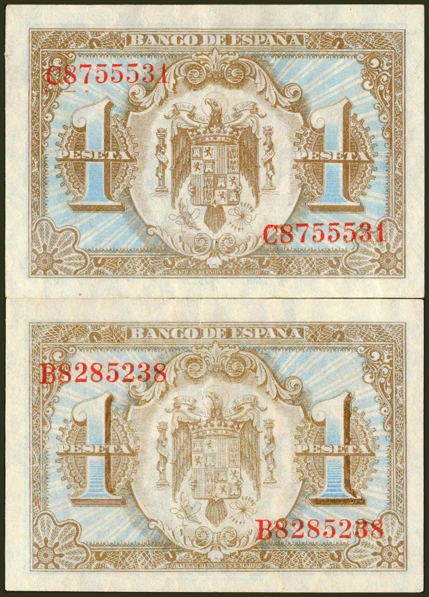 Conjunto de 2 billetes de 1 Peseta emitidos el 1 de Junio de 1940, con las serie B y C, respectivamente (Edfil 2021: 441a), conservando gran parte de su apresto original. EBC.