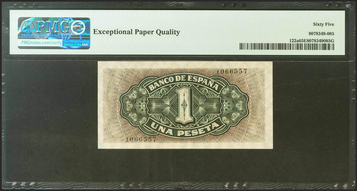1 Peseta. 4 de Septiembre de 1940. Sin serie. (Edifil 2021: 442, Pick: 122a). Inusual en esta excepcional calidad, apresto original. SC. Encapsulado PMG65EPQ.