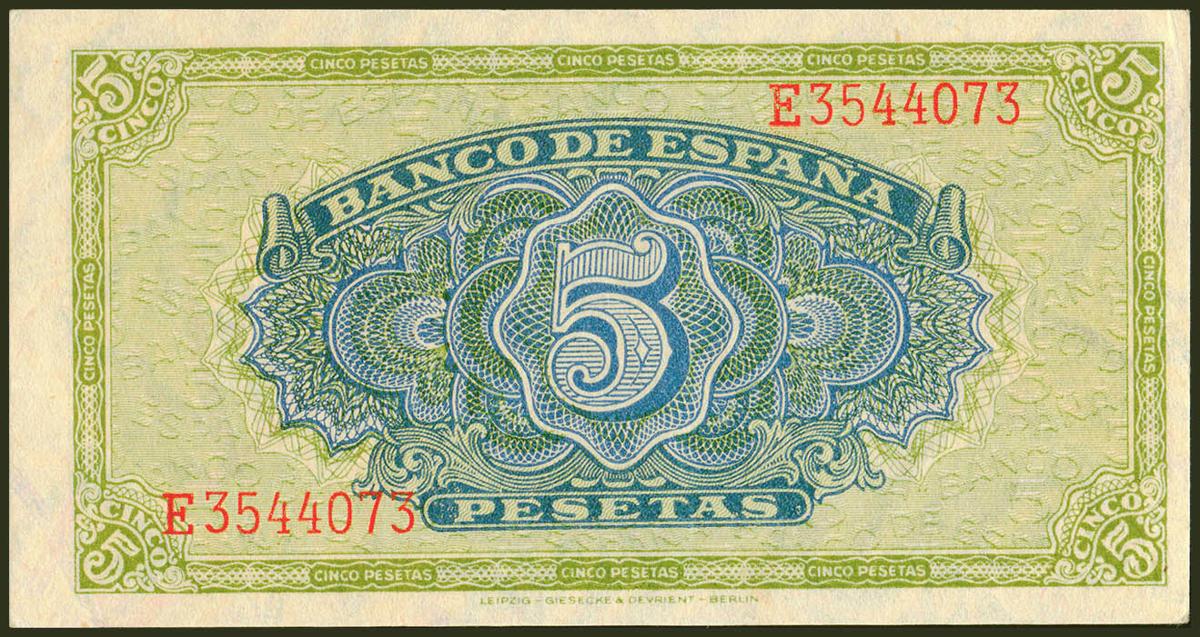 5 Pesetas. 4 de Septiembre de 1940. Serie E. (Edifil 2021: 443a). Conserva gran parte de su apresto original. EBC++.