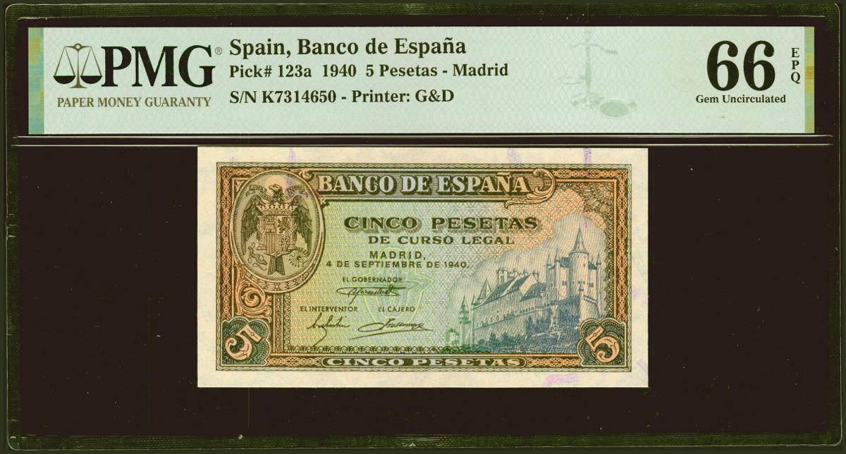 5 Pesetas. 4 de Septiembre de 1940. Serie K. (Edifil 2021: 443a, Pick: 123a). Raro en esta excepcional calidad, apresto original. SC. Encapsulado PMG66EPQ.