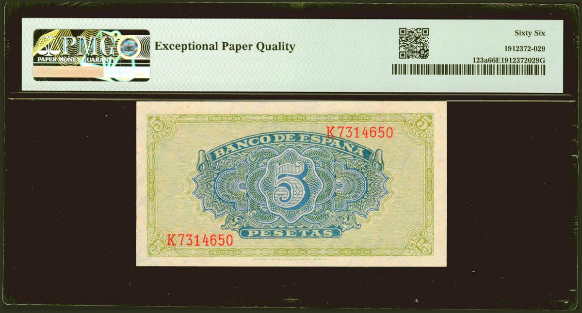 5 Pesetas. 4 de Septiembre de 1940. Serie K. (Edifil 2021: 443a, Pick: 123a). Raro en esta excepcional calidad, apresto original. SC. Encapsulado PMG66EPQ.