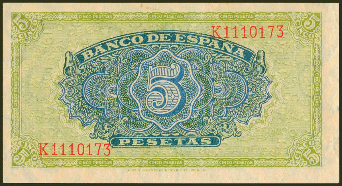 5 Pesetas. 4 de Septiembre de 1940. Serie K. (Edifil 2021: 443a). Conserva todo su apresto original. SC.