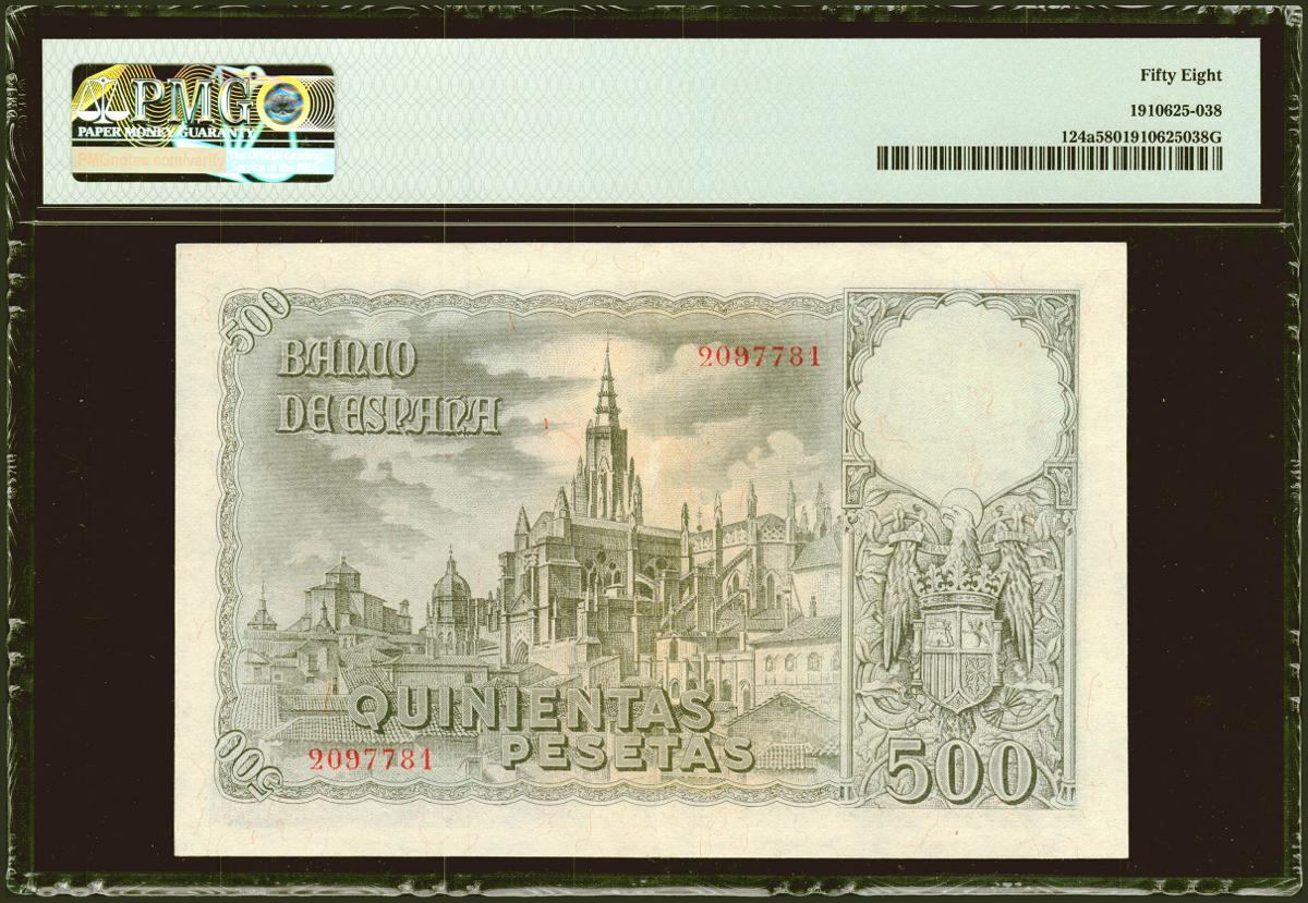500 Pesetas. 21 de Octubre de 1940. Sin serie. (Edifil 2021: 444, Pick: 124a). Inusual en esta excepcional calidad. EBC++. Encapsulado PMG58.