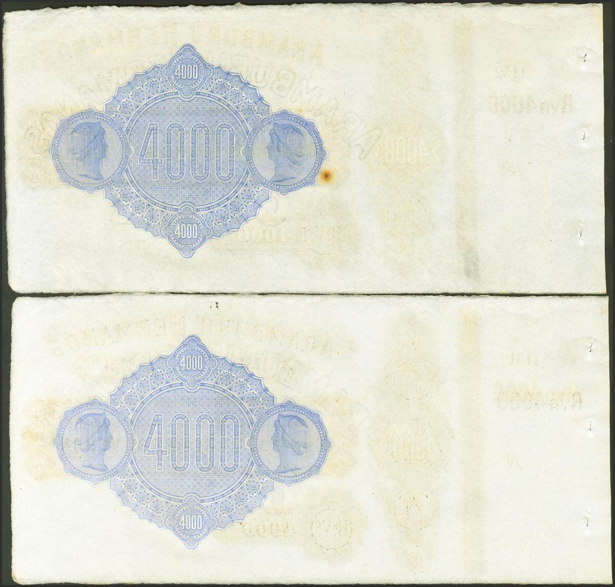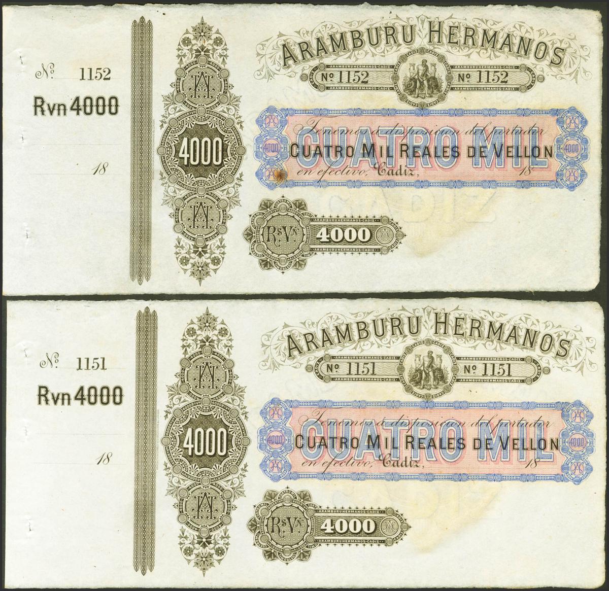 4000 Reales de Vellón. (18__ca). Pareja correlativa. Aramburu Hermanos, Cádiz (matriz a la izquierda)(manchitas de tiempo). Para entender mejor la contextualización de este billete recomendamos la obra "Obligaciones, vales y documentos puestos en circulación como papel moneda en España", de Don Ramón Cobo Huici. SC-/SC--