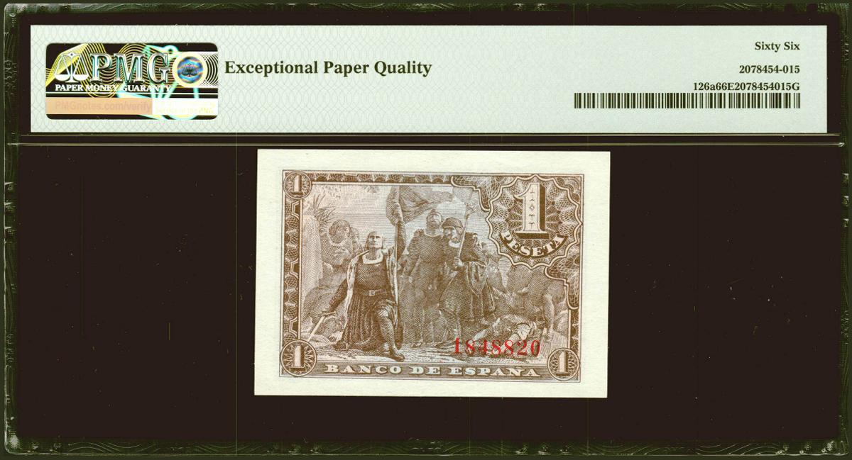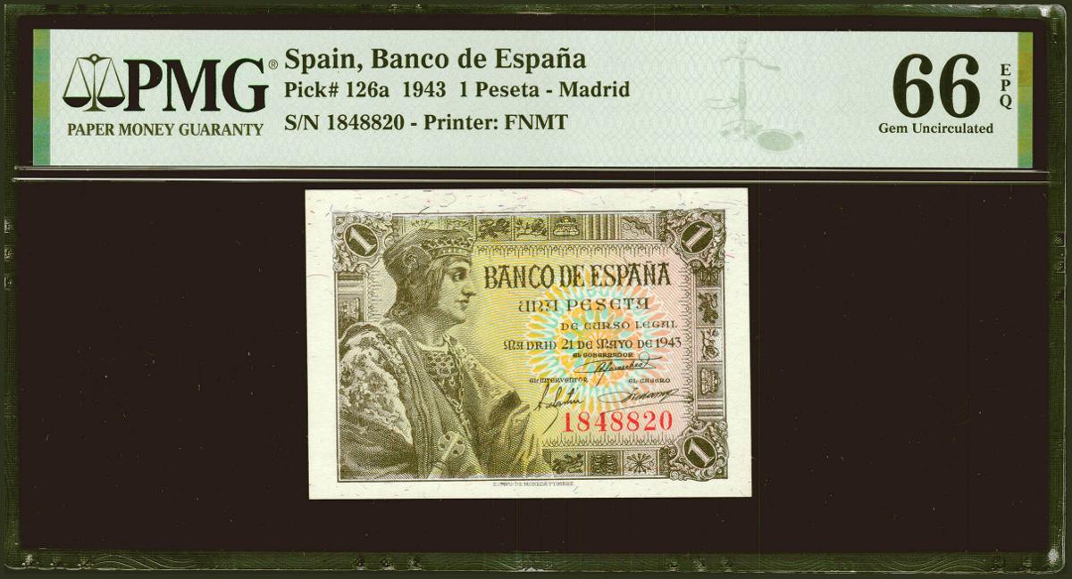 1 Peseta. 21 de Mayo de 1943. Sin serie. (Edifil 2021: 447, Pick: 126a). Raro en esta excepcional calidad, apresto original. SC. Encapsulado PMG66EPQ.
