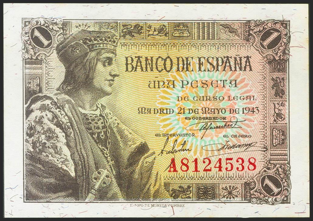 1 Peseta. 21 de Mayo de 1943. Serie A. (Edifil 2021: 447a). Apresto original. SC.