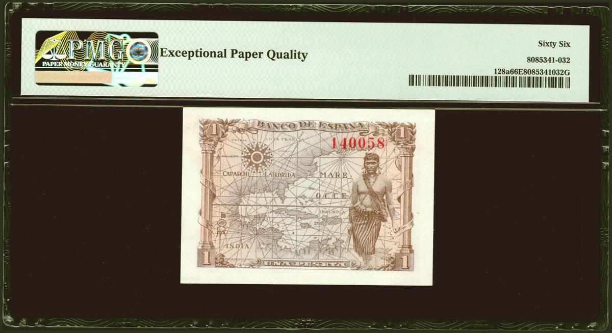 1 Peseta. 15 de Junio de 1945. Sin serie. (Edifil 2021: 448, Pick: 128a). Apresto original. SC. Encapsulado PMG66EPQ.
