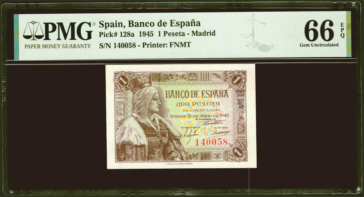 1 Peseta. 15 de Junio de 1945. Sin serie. (Edifil 2021: 448, Pick: 128a). Apresto original. SC. Encapsulado PMG66EPQ.