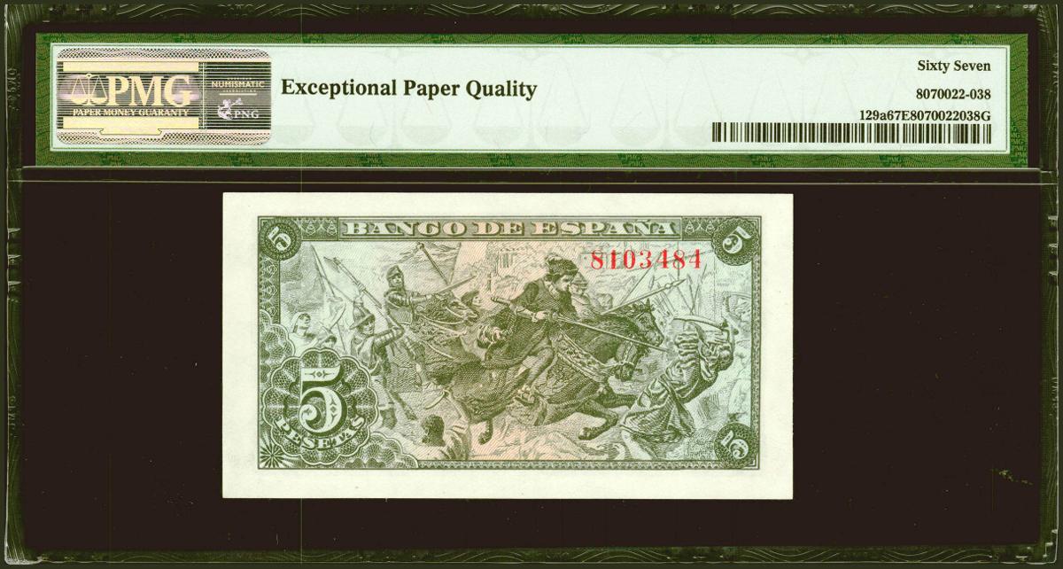 5 Pesetas. 15 de Junio de 1945. Sin serie. (Edifil 2021: 449, Pick: 129a). Muy raro en esta excepcional calidad, apresto original. SC. Encapsulado PMG67EPQ.