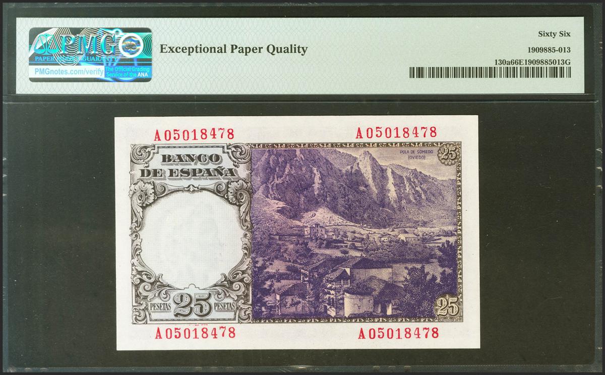 25 Pesetas. 20 de Febrero de 1946. Serie A. (Edifil 2021: 450a, Pick: 130a). Raro en esta excepcional calidad, apresto original. SC. Encapsulado PMG66EPQ.
