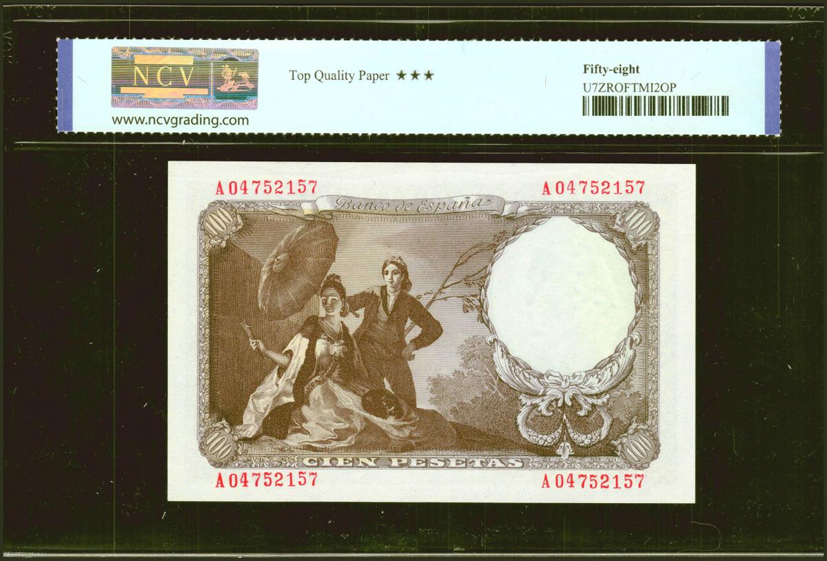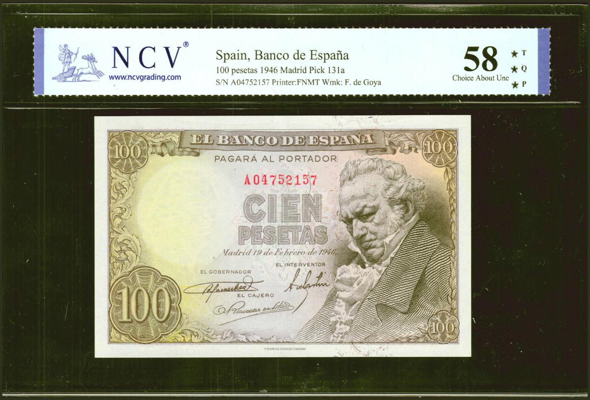 100 Pesetas. 19 de Febrero de 1946. Serie A. (Edifil 2021: 451a, Pick: 131a). Apresto original. EBC+++. Encapsulado NCV58TQP.