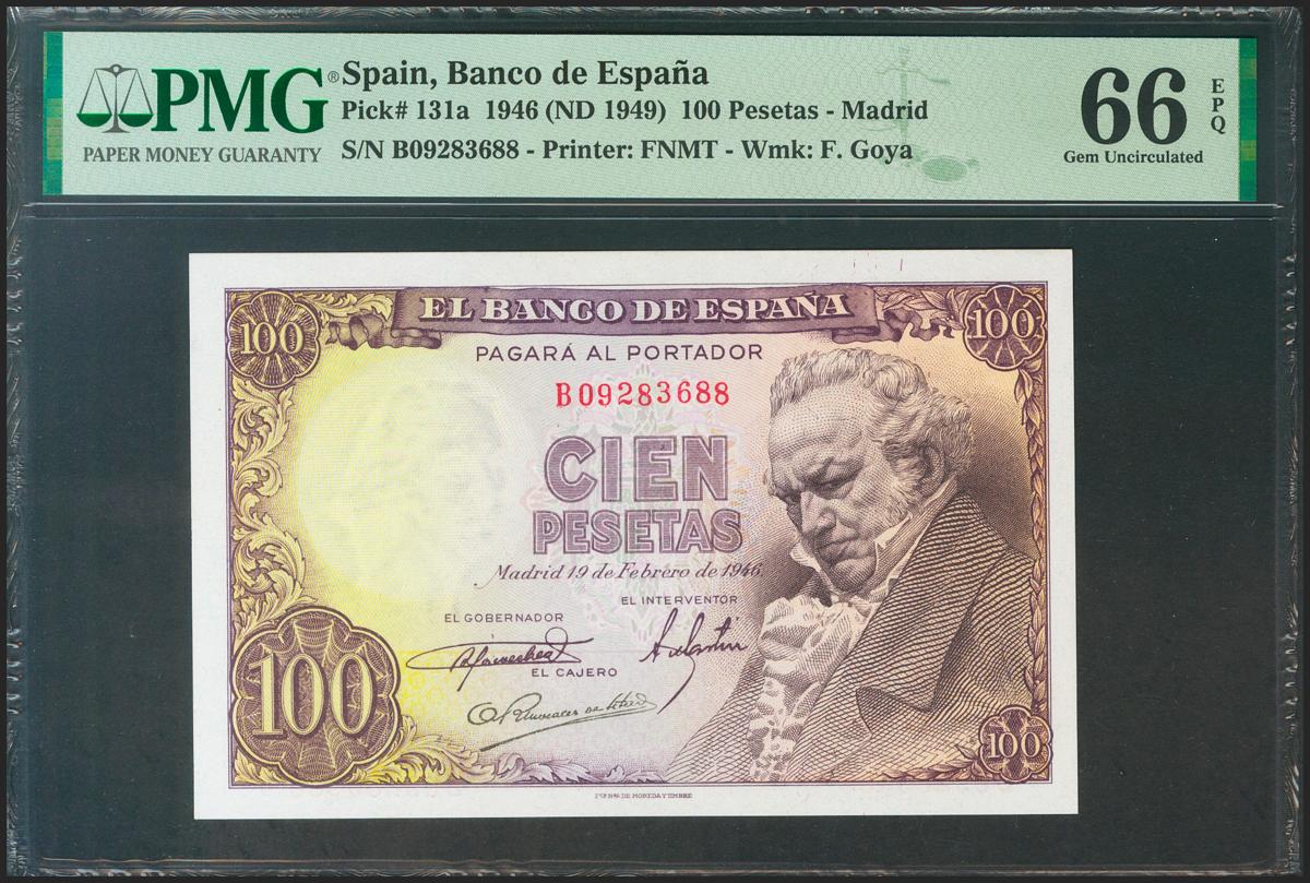 100 Pesetas. 19 de Febrero de 1946. Serie B. (Edifil 2021: 451, Pick: 131a). Raro en esta calidad, apresto original. SC. Encapsulado PMG66EPQ.