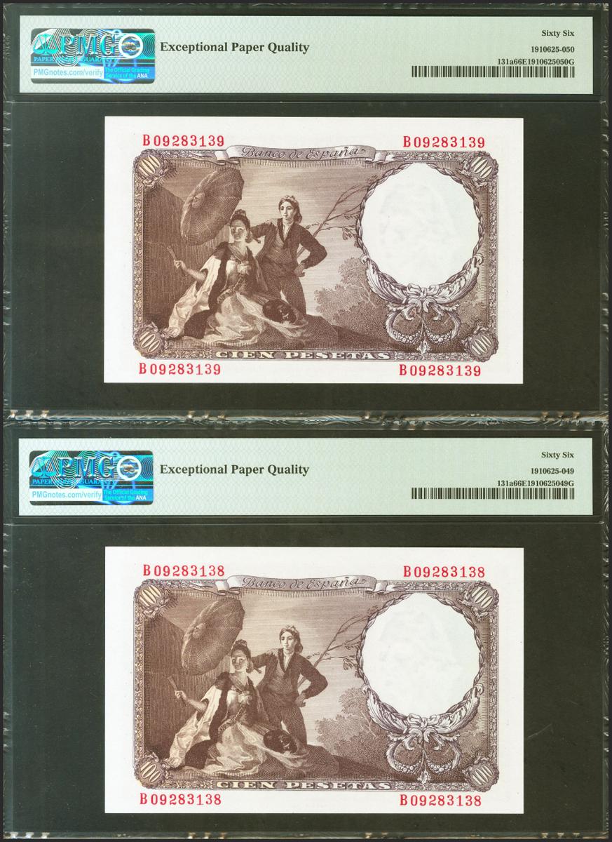 100 Pesetas. 19 de Febrero de 1946. Pareja correlativa. Serie B. (Edifil 2017: 451b). Rara en esta excepcional calidad, apresto original. SC. Encapsulados PMG66EPQ, ambos.