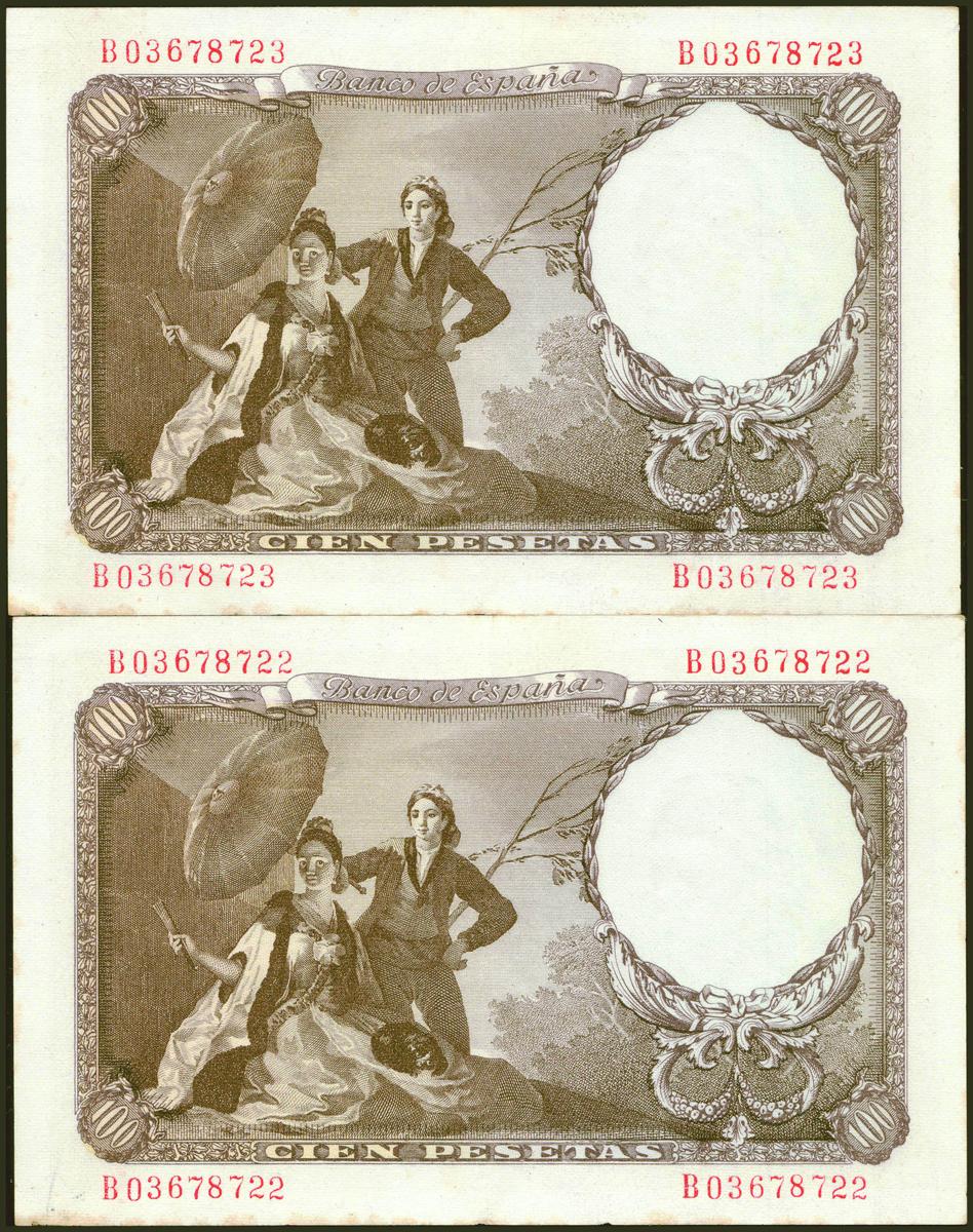 100 Pesetas. 19 de Febrero de 1946. Pareja correlativa. Serie B. (Edifil 2021: 451b). Conserva parte de su apresto original, sombritas del tiempo. EBC.