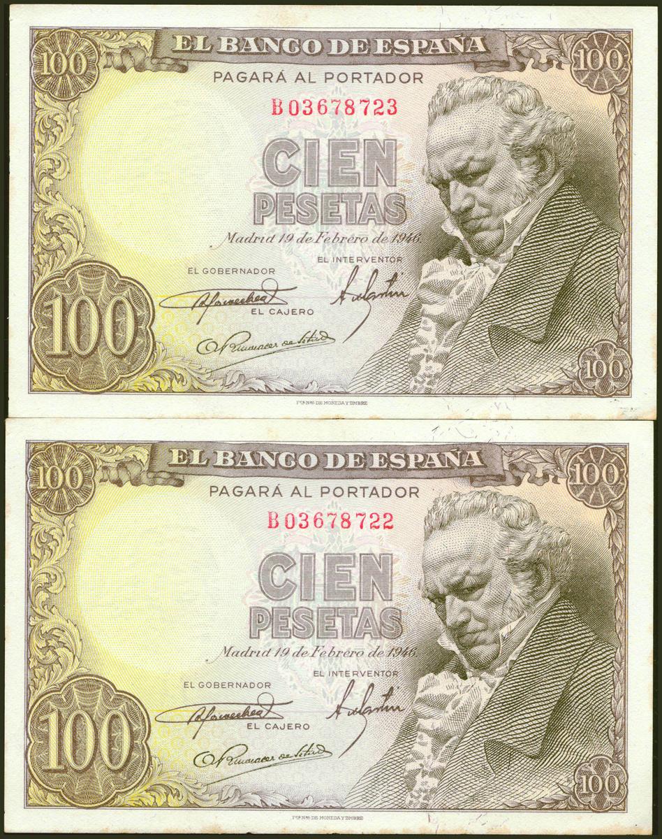 100 Pesetas. 19 de Febrero de 1946. Pareja correlativa. Serie B. (Edifil 2021: 451b). Conserva parte de su apresto original, sombritas del tiempo. EBC.