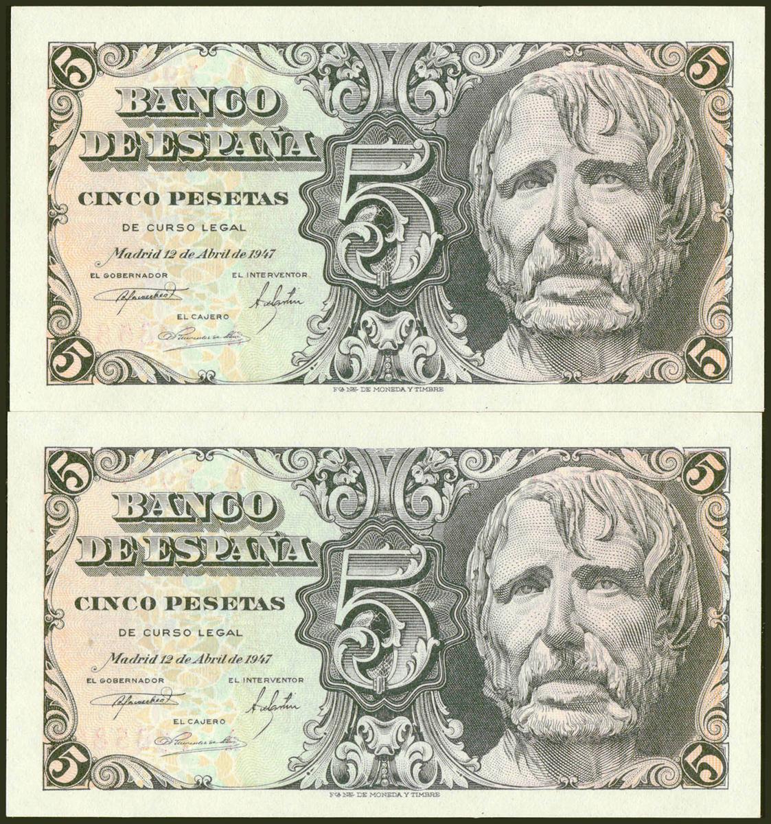5 Pesetas. 12 de Abril de 1947. Pareja correlativa. Serie A. (Edifil 2021: 454a). Conserva todo su apresto original. SC.
