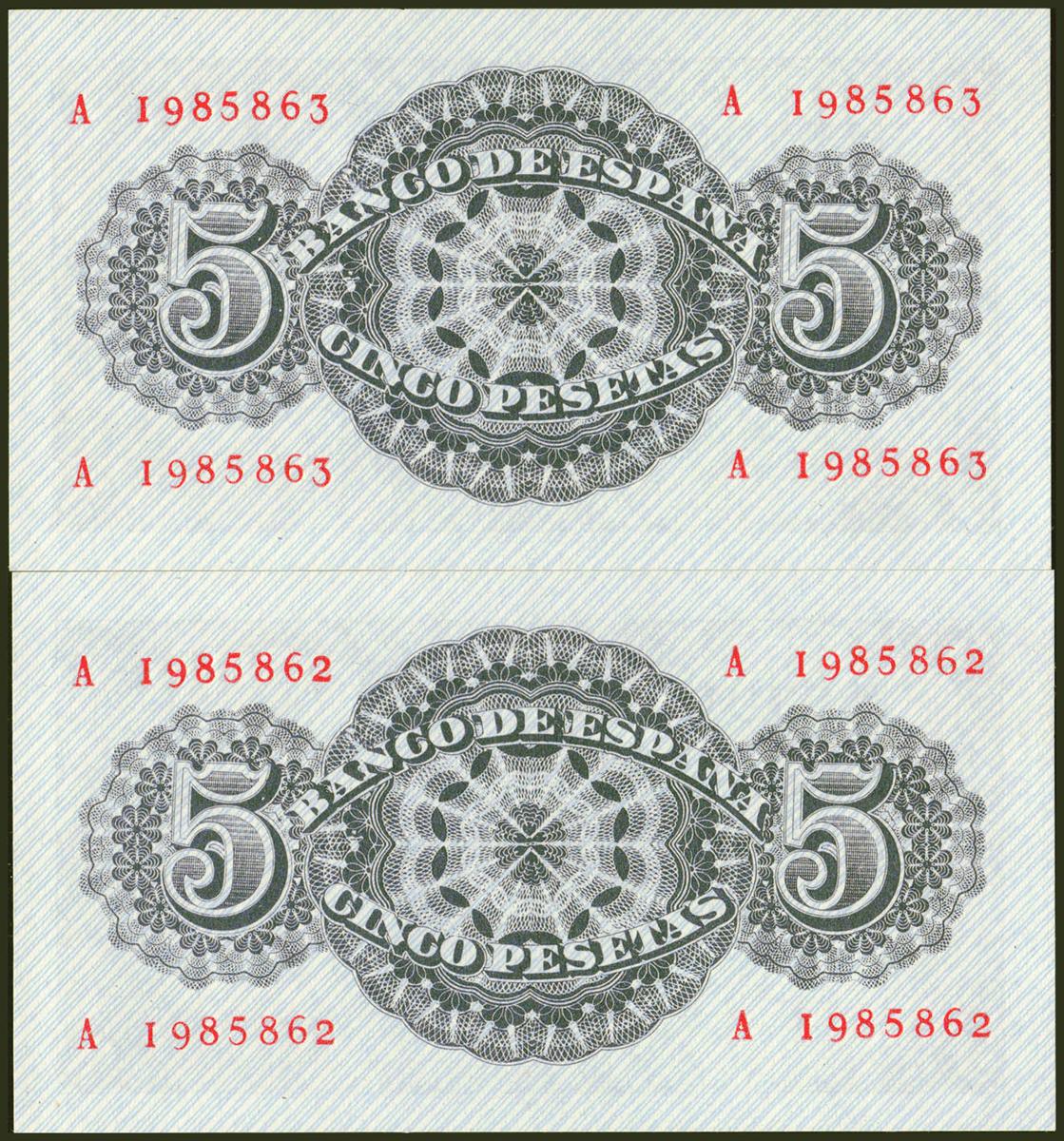 5 Pesetas. 12 de Abril de 1947. Pareja correlativa. Serie A. (Edifil 2021: 454a). Conserva todo su apresto original. SC.