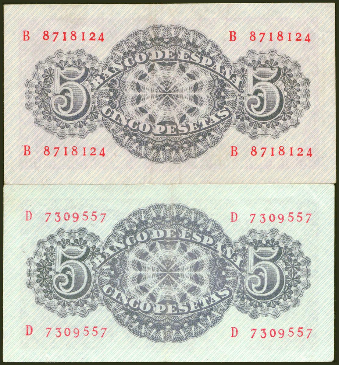 Conjunto de 2 billetes del 5 Pesetas, emitidos el 12 de Abril de 1947, con la series B y D, respectivamente (Edifil 2021: 454a), presentan algo de apresto original. EBC-.