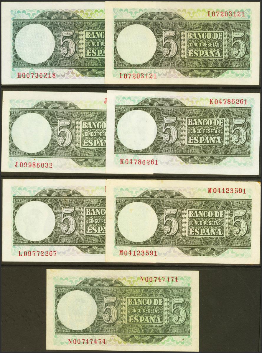 Conjunto de 15 billetes de 5 Pesetas emitidos el 15 de Marzo de 1948 y correspondientes a todas las series conocidas que incluyen el sin serie y las series A, B, C, D, E, F, G, H, I , J, K , L, M, N (Edifil 2021: 455, 455a, 455b). Muy inusual conjunto que incluye todas las diferentes series emitidas incluyendo la rarísima serie N (la serie N en conservación EBC+). SC/EBC-.