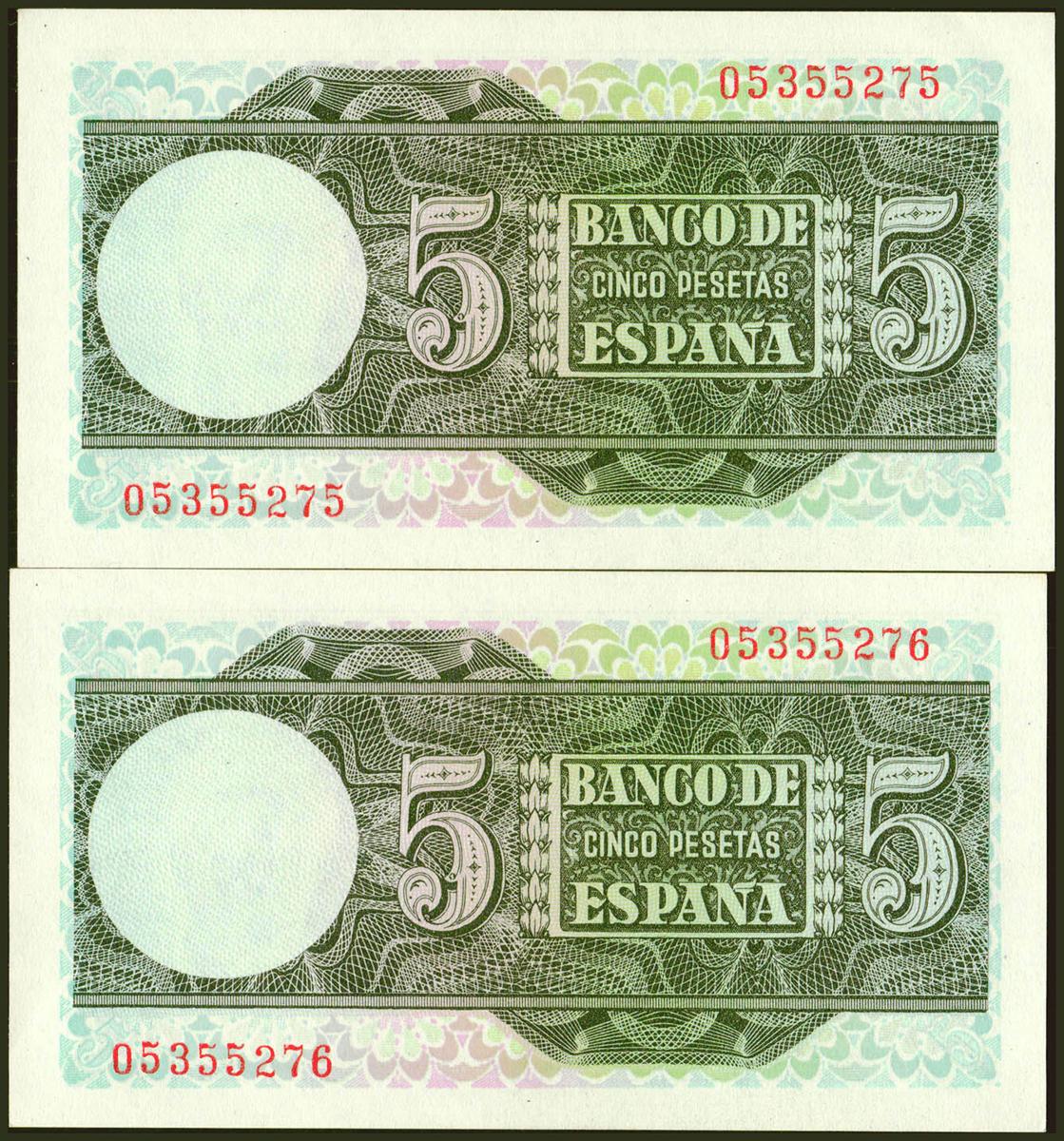 5 Pesetas. 15 de Marzo de 1948. Pareja correlativa. Sin serie. (Edifil 2021: 455). Apresto original. SC.
