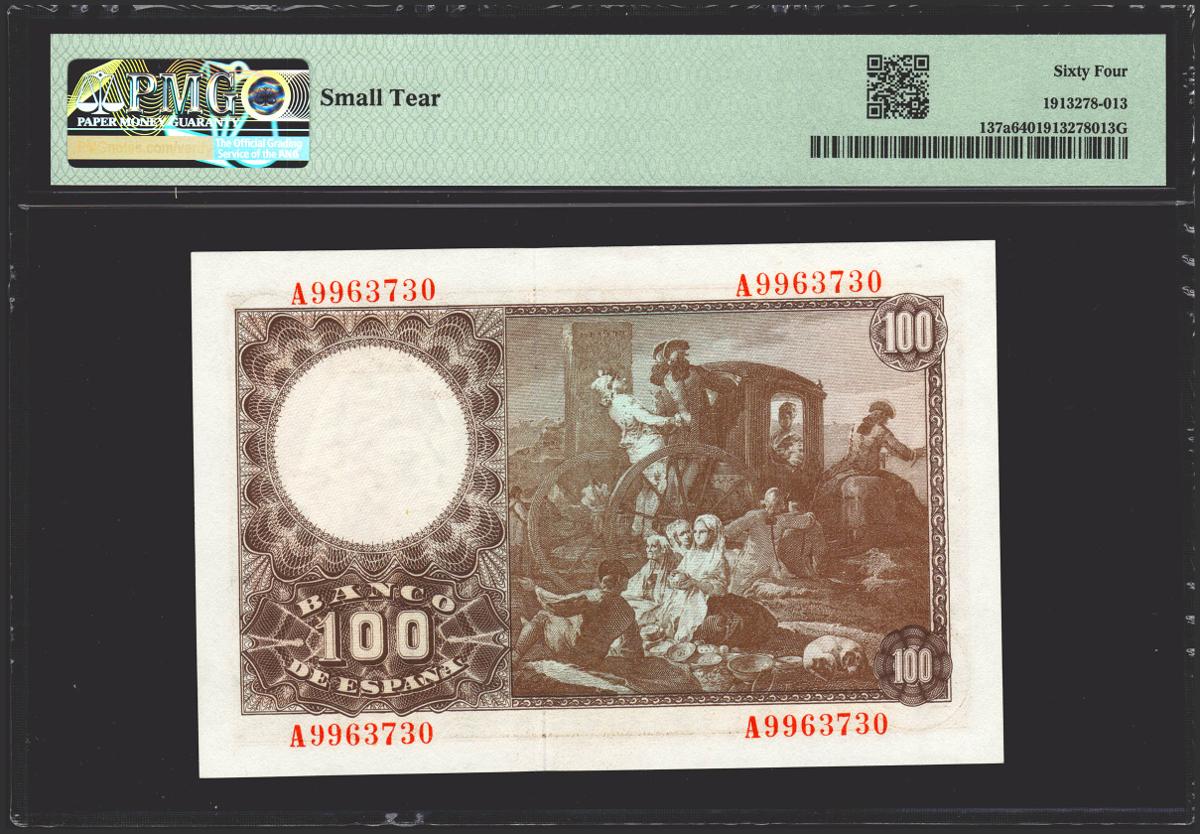 100 Pesetas. 2 de Mayo de 1948. Serie A. (Edifil 2021: 456a, Pick: 137a). SC. Encapsulado PMG64 (small tear).