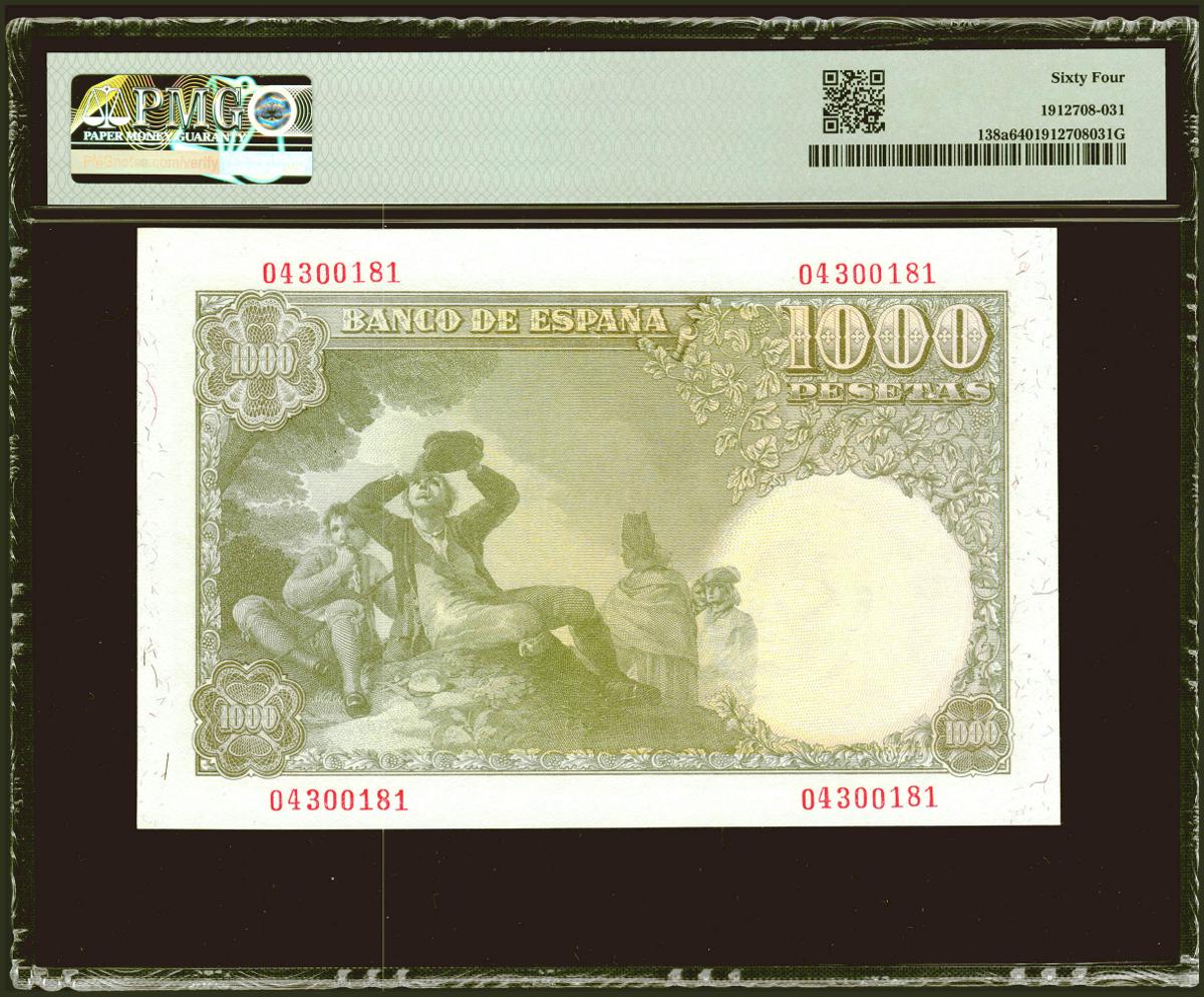 1000 Pesetas. 4 de Noviembre de 1949. Sin serie. (Edifil 2021: 458, Pick: 138a). Raro en esta excepcional calidad. SC. Encapsulado PMG64.