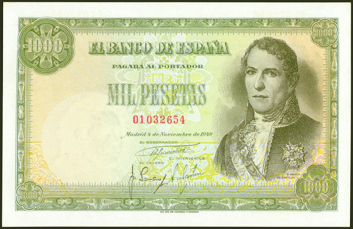 1000 Pesetas. 4 de Noviembre de 1949. Sin serie. (Edifil 2021: 458, Pick: 138a). Raro en esta excepcional calidad. SC-.