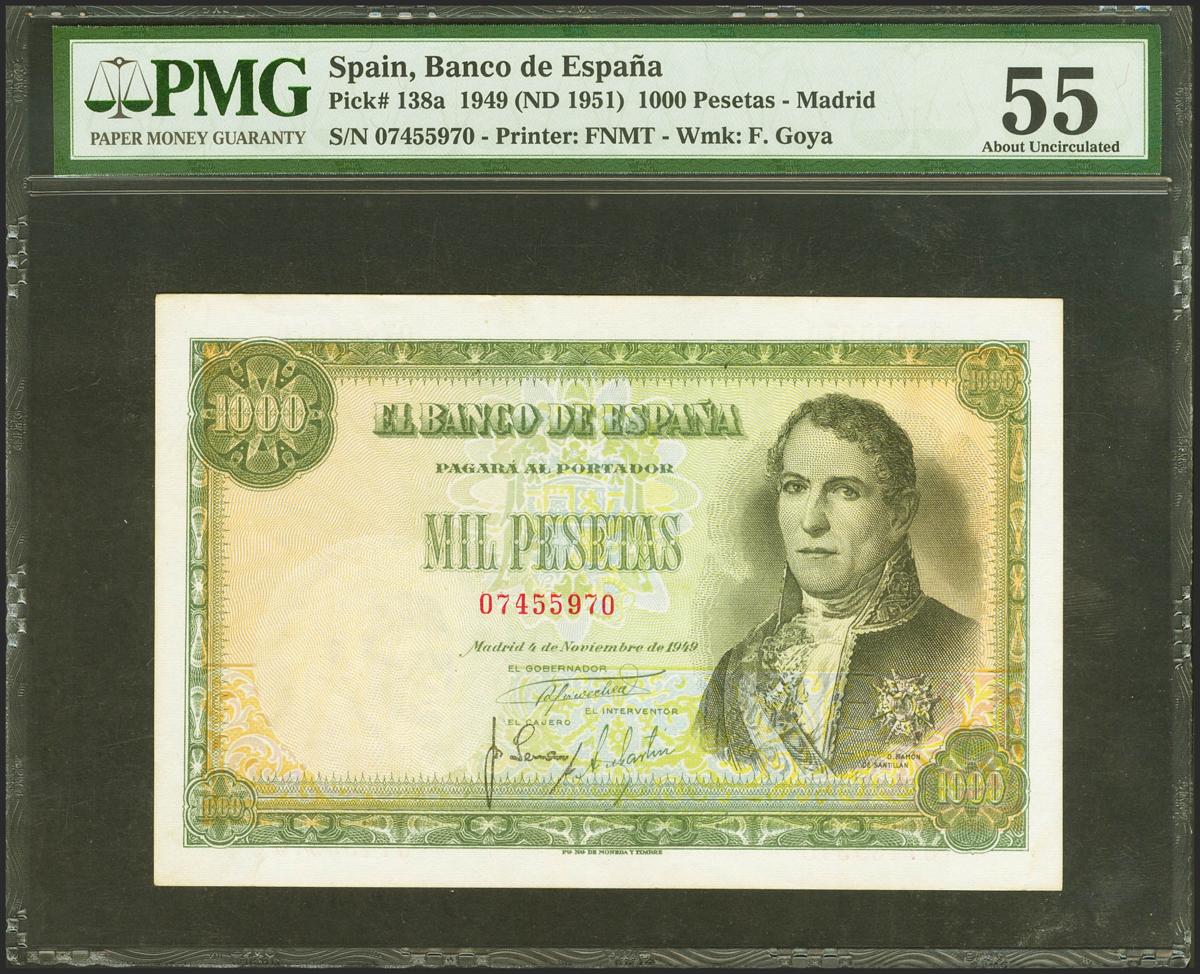 1000 Pesetas. 4 de Noviembre de 1949. Sin serie. (Edifil 2021: 458, Pick: 138a). Inusual. EBC++. Encapsulado PMG55.