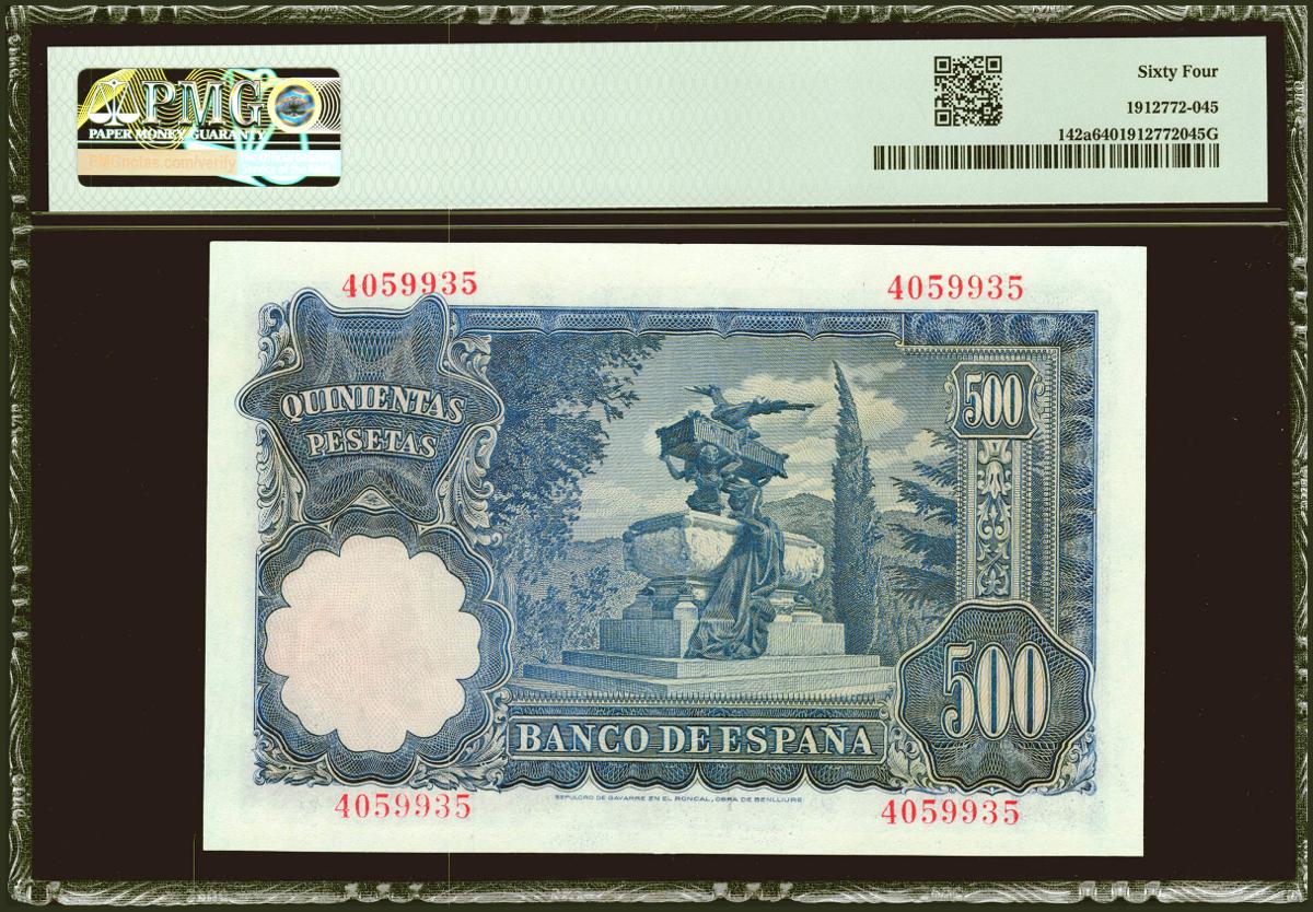 500 Pesetas. 15 de Noviembre de 1951. Sin serie. (Edifil 2021: 460, Pick: 142). SC. Encapsulado PMG64.