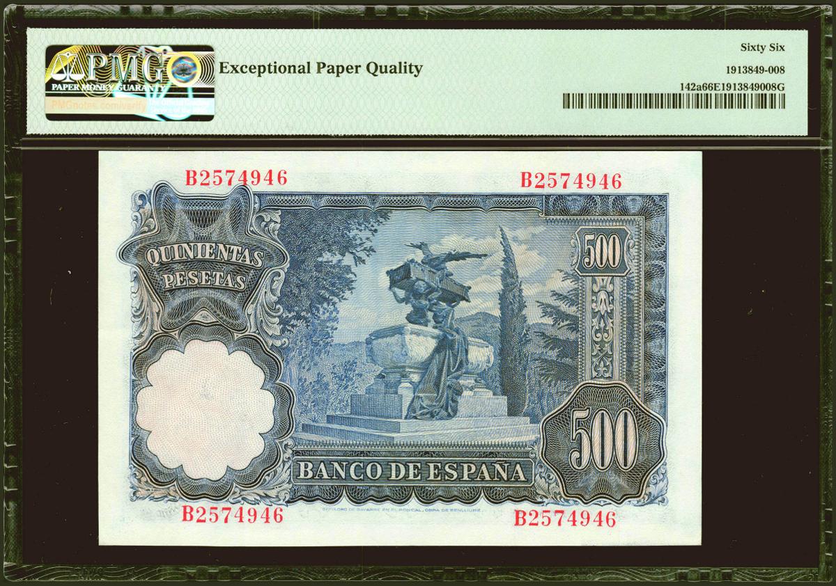 500 Pesetas. 15 de Noviembre de 1951. Serie B. (Edifil 2021: 460a, Pick: 142a). Rarísimo en esta excepcional calidad, apresto original. SC. Encapsulado PMG66EPQ.