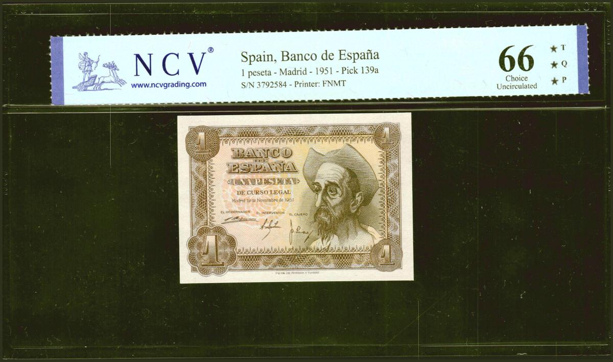 1 Peseta. 19 de Noviembre de 1951. Sin serie. (Edifil 2021: 461, Pick: 139a). Inusual en esta calidad, apresto original. SC. Encapsulado NCV66TQP.