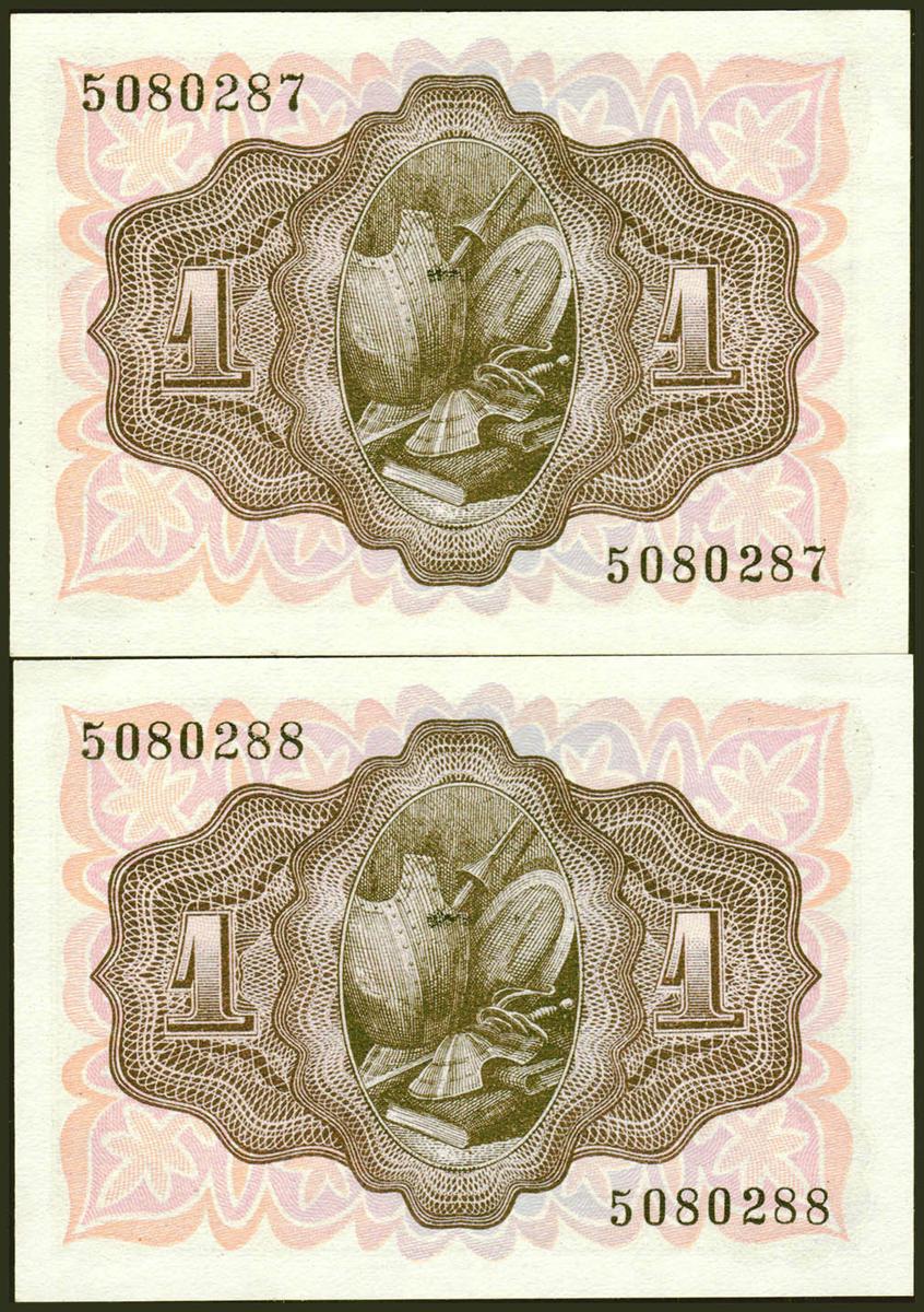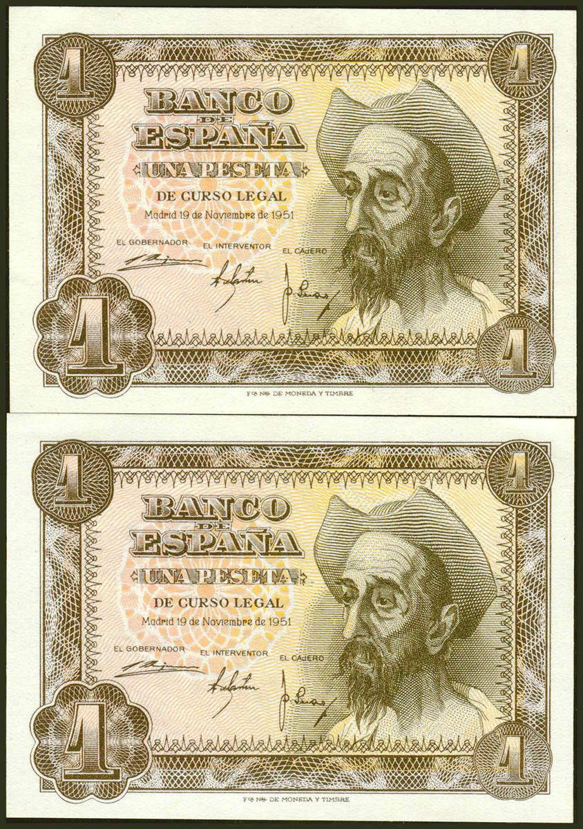 1 Peseta. 19 de Noviembre de 1951. Pareja correlativa. Sin serie. (Edifil 2021: 461). Conserva todo su apresto original. SC