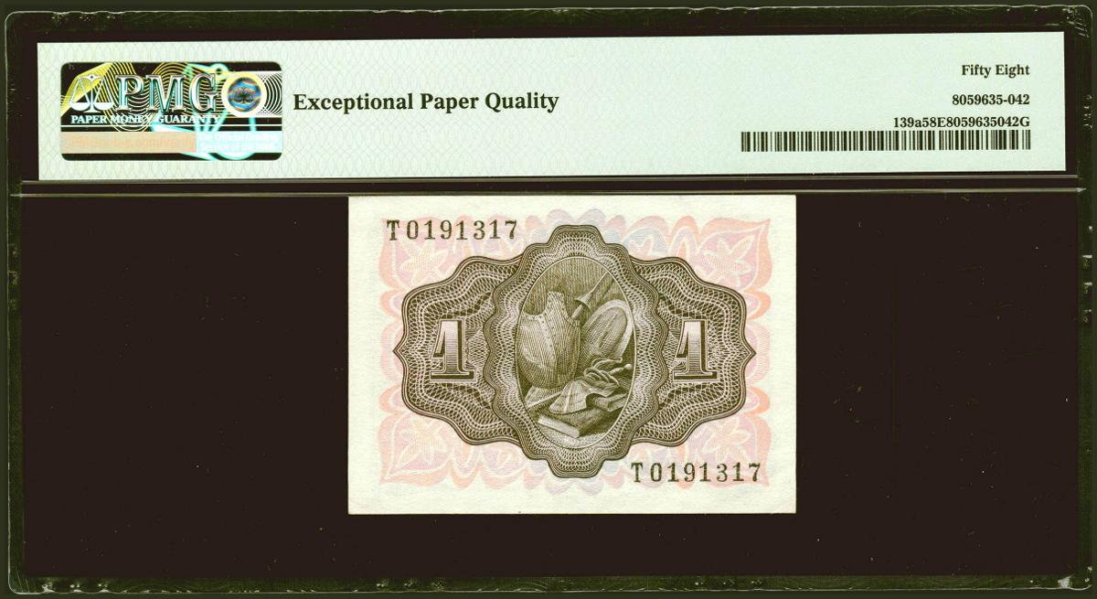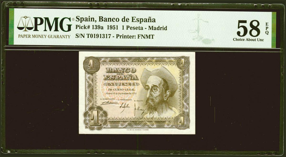 1 Peseta. 19 de Noviembre de 1951. Serie T, última serie emitida. (Edifil 2021: 461b, Pick: 139a). Apresto original. EBC+++. Encapsulado PMG58EPQ.