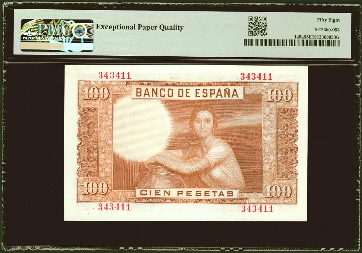 100 Pesetas. 7 de Abril de 1953. Sin serie. (Edifil 2021: 464, Pick: 145a). Apresto original. EBC+++. Encapsulado PMG58EPQ.