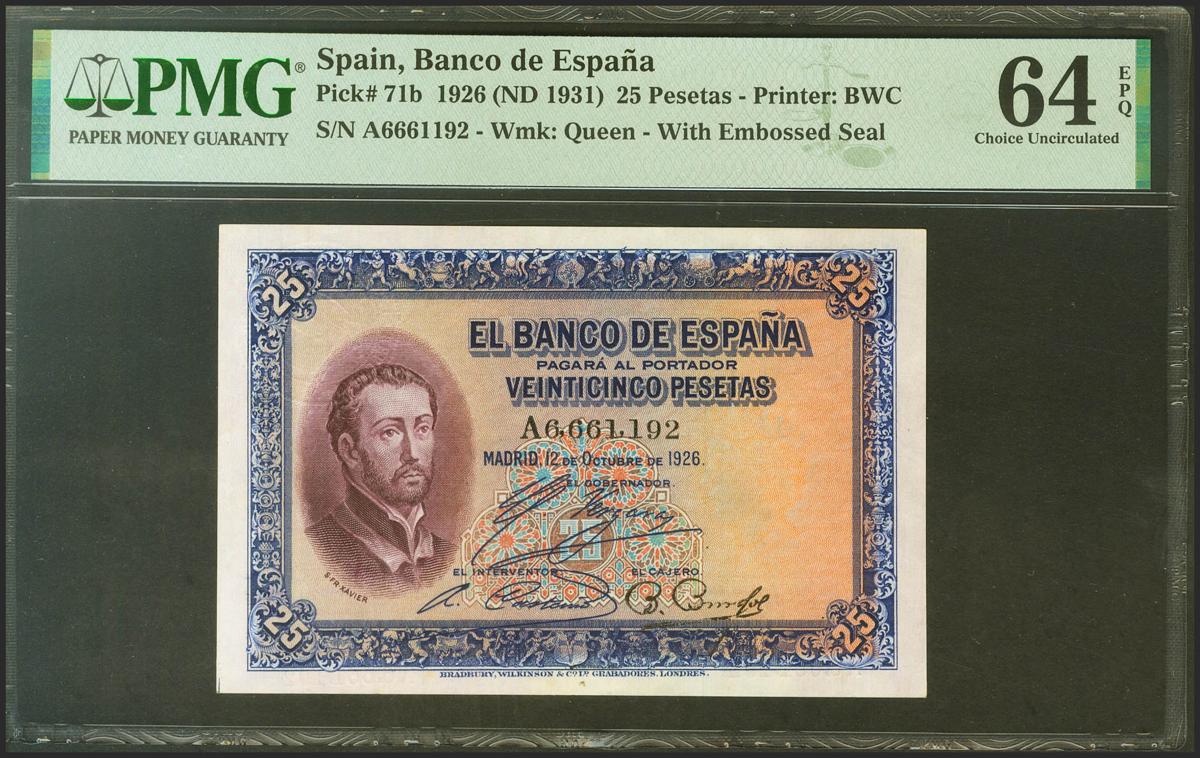 25 Pesetas. 12 de Octubre de 1926. Serie A y sello en seco GOBIERNO PROVISIONAL DE LA REPUBLICA / 14 ABRIL 1931. (Edifil 2021: 335, Pick: 71b). Rarísimo en esta calidad y apresto original. SC. Encapsulado PMG64EPQ.