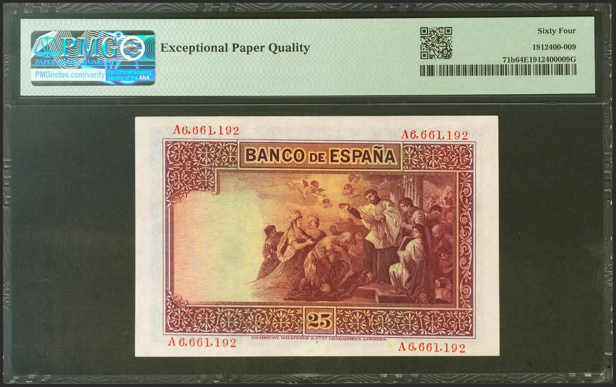 25 Pesetas. 12 de Octubre de 1926. Serie A y sello en seco GOBIERNO PROVISIONAL DE LA REPUBLICA / 14 ABRIL 1931. (Edifil 2021: 335, Pick: 71b). Rarísimo en esta calidad y apresto original. SC. Encapsulado PMG64EPQ.