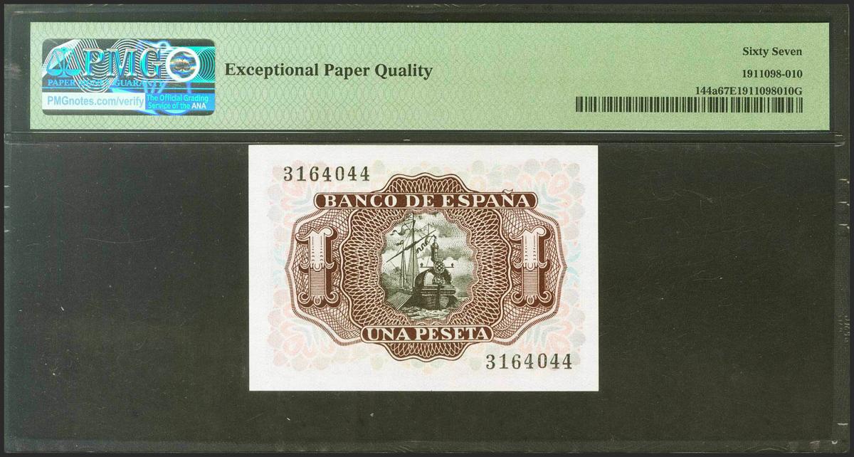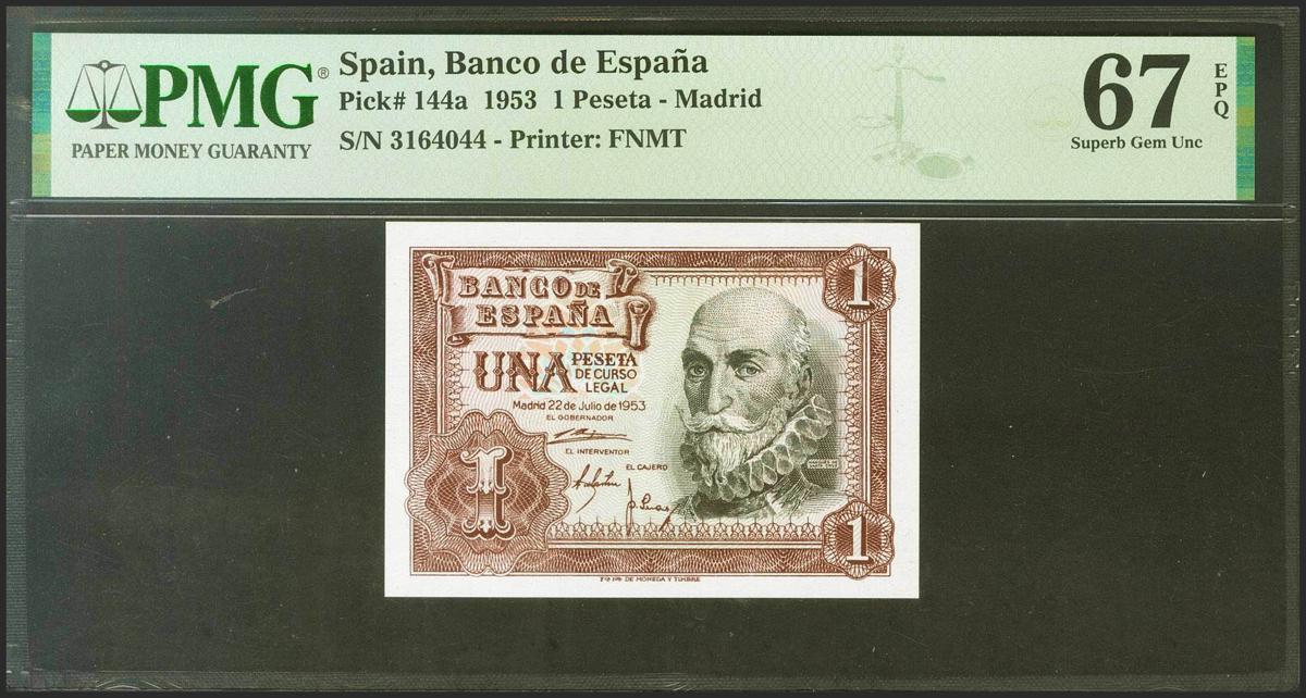 1 Peseta. 22 de Julio de 1953. Sin serie. (Edifil 2021: 465, Pick: 144a). Muy raro en esta excepcional calidad, apresto original. SC. Encapsulado PMG67EPQ.