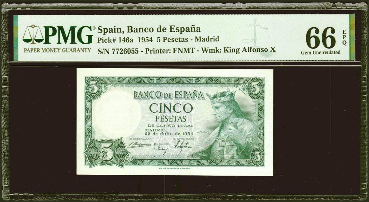 5 Pesetas. 22 de Julio de 1954. Sin serie. (Edifil 2021: 466, Pick: 146a). Raro en esta calidad, apresto original. SC. Encapsulado PMG66EPQ.