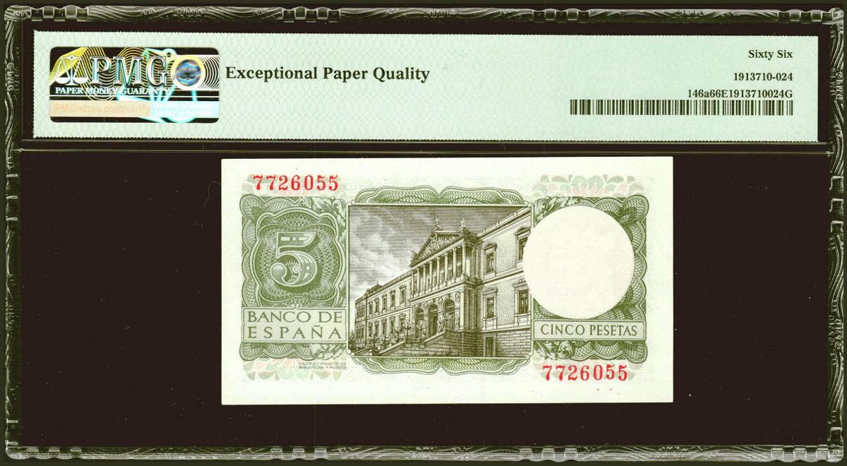 5 Pesetas. 22 de Julio de 1954. Sin serie. (Edifil 2021: 466, Pick: 146a). Raro en esta calidad, apresto original. SC. Encapsulado PMG66EPQ.